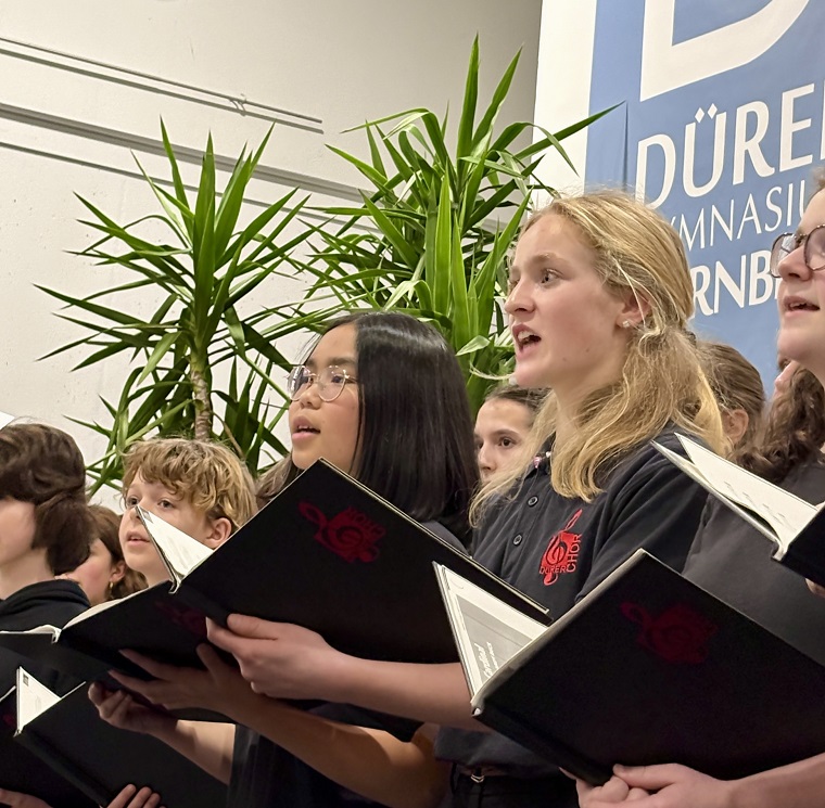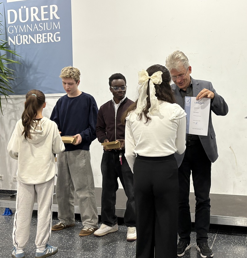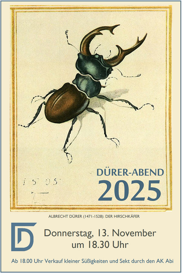 Am Abend des 13. November versammelten sich wieder stolze Eltern, Freunde und Lehrkräfte in der Aula. Sie alle kamen, um zu erleben, wie ihre Kinder, Freunde oder Schüler feierlich ihre Dürer-Urkunden überreicht bekommen. Diese werden am Dürer-Gymnasium traditionell denjenigen Schülerinnen und Schülern verliehen, die im vergangenen Schuljahr hervorragende schulische Leistungen erzielt oder besonderes Engagement gezeigt haben. Knapp 50 Ehrenurkunden gingen an Schülerinnen und Schüler, deren Gesamtnotenschnitt im Jahreszeugnis 2024/25 bei 1,5 oder besser lag. Wir gratulieren herzlich zu diesen hervorragenden Ergebnissen! Die Stars des Abends in der zweiten Kategorie waren unter anderem Schülerinnen und Schüler, die als Vertreter des Dürer-Gymnasiums an verschiedenen Wettbewerben - zum Beispiel aus den Bereichen Robotik, Schach, Mathematik, Jugend debattiert, Fremdsprachen - erfolgreich teilgenommen und Preisplätze belegt hatten; Schülerinnen und Schüler, die als IT-Scouts oder Wertebotschafter entsprechende Workshops für ihre jüngeren Mitschüler vorbereitet und geleitet hatten; Schülerinnen und Schüler, die sich durch langjähriges besonderes Engagement im Schulsanitätsdienst oder in der Tutorenarbeit ausgezeichnet hatten. Besonders gewürdigt wurden außerdem die Mitglieder der schulischen Theatergruppe Mittelstufe, die im vergangenen Schuljahr - während ihre Kursleitung in Elternzeit war - absolut selbständig und mit einer beeindruckenden Professionalität ein Stück auf die Bühne brachten. Insgesamt wurden in diesem Jahr mehr als 120 Urkunden überreicht. Alle geehrten Schülerinnen und Schüler bekamen außerdem Buchgutscheine und Dürer-Stifte. Der Dürerchor sorgte für ein passendes musikalisches Rahmenprogramm und der AK Abi für einen leckeren Empfang. |