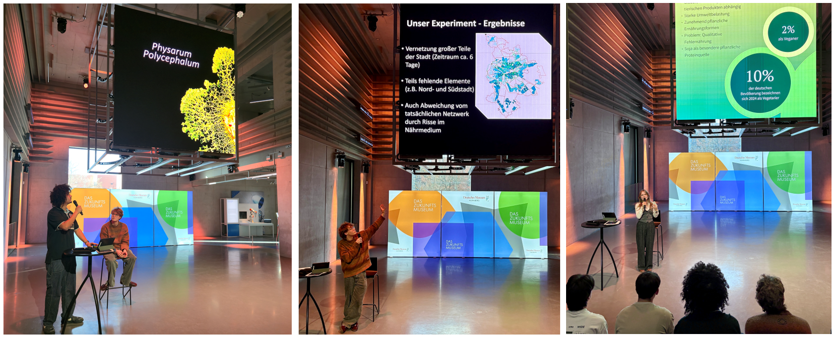 Ein Schülerteam aus dem Bereich Städtebau und Bionik untersuchte mithilfe eines wachsenden Schleimpilzes, wie effizient das Verkehrsnetz der Stadt Nürnberg aufgebaut ist. In einem weiteren Projekt standen bio-inspirierte Ansätze für nachhaltiges Bauen im Mittelpunkt, bei denen natürliche Vorbilder als Grundlage für zukunftsfähige Architektur dienten. Auch ernährungswissenschaftliche Fragestellungen waren vertreten: In einem Projekt wurden Sojabohnen fermentiert, um zu analysieren, wie sich der Prozess der Fermentation auf die Konzentration freier Aminosäuren auswirkt. |