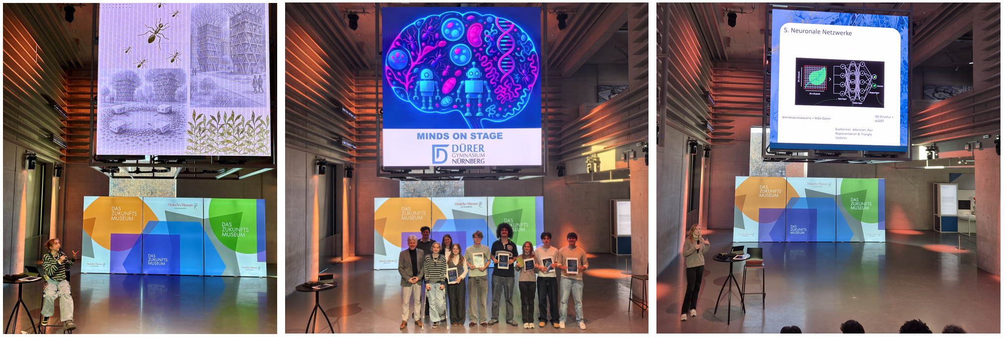 Der Fachbereich Biologie lieferte gleich drei Präsentationen. Dabei ging es um die Möglichkeiten und Grenzen von AlphaFold bei der Proteinstrukturbestimmung, um Ansätze zur Telomerase-Aktivierung sowie um die Rolle mitochondrialer Dysfunktion bei Sepsis. Das besondere Setting trug maßgeblich zur Atmosphäre der Veranstaltung bei: Dort, wo normalerweise der humanoide Roboter Amica Besucherinnen und Besucher empfängt, standen an diesem Nachmittag unsere Schülerinnen und Schüler im Mittelpunkt. Im Publikum befanden sich neben Mitschülerinnen und Mitschülern auch Lehrkräfte aus dem MINT-Bereich, Eltern sowie Mitglieder der Schulleitung. Die Schulreferentin Frau Cornelia Trinkl eröffnete die Veranstaltung mit einer kurzen Begrüßung. |