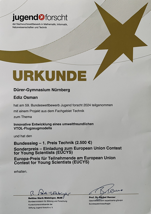 Zweieinhalb Stunden gespannten Wartens während der feierlichen Siegerehrung zum diesjährigen Bundeswettbewerb Jugend forscht in Heilbronn waren bereits vergangen. Dann war es endlich so weit: „Der erste Preis im Fachgebiet Technik geht an Ediz Osman“. Wir sind tief beeindruckt und gratulieren unserem Schüler Ediz herzlich zu diesem unfassbar tollen Erfolg.