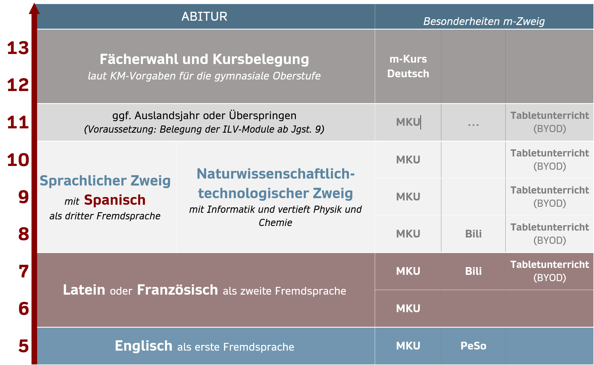 Die Wochenstundenzahlen weichen nur geringfügig von denen der Regelklassen ab. Die Stundentafel unserer m-Klassen enthält einige Besonderheiten: